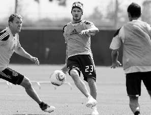 2月24日,洛杉矶银河队球员贝克汉姆(中)在训练中。当日,贝克汉姆在美国加利福尼亚州的卡森进行训练,备战美国足球大联盟新赛季的比赛。 新华社发