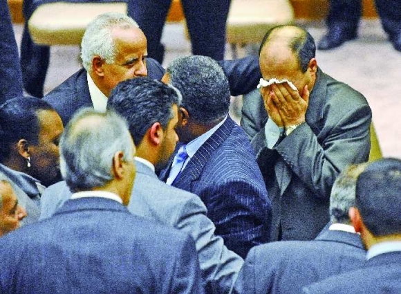 2月25日,在纽约联合国总部,利比亚常驻联合国副代表达巴希(右一)在安理会会议结束后哭泣,与会人员对他进行安慰。当日,联合国安理会就利比亚当前局势举行公开会议。 新华社发