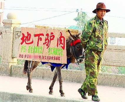 自述:一家卖驴肉的餐馆顾人牵着活驴上街打广告。