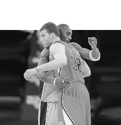 北京时间26日,NBA洛杉矶德比战隆重上演。湖人队108:95轻松拿下快船队,科比只打了三节,拿下24分5次助攻。快船队当家球星布雷克·格里芬抢下22分10个篮板。图为科比和格里芬互相致意。