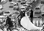 一对无房无车“裸婚”的“80后”骑车经过北京建国门桥上。
