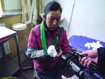 记者在省立医院看到,隗女士右手拇指处包着厚厚的绷带(上图),她丈夫在一旁很焦急。不过隗女士表示,“到现在都没怎么感觉疼。”据家人介绍,隗女士在章丘一家乐器厂上班。27日上午8点多,隗女士在工作时,右手手套突然被挂住,随后手被高速运转的机器卷了进去。旁边工友见状,马上将机器停下来,并试图将隗女士的手拉出来。但由于手指卷入较深,众人用力之下,竟然将她手指拽断。