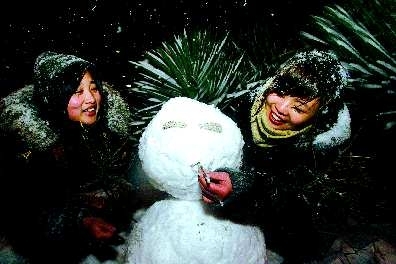 两个女孩高兴地堆雪人。 记者 廖杰 摄