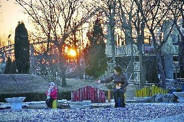 3月3日,德州新湖风景区,夕阳映红天际,留下一日中最后的绚烂。树下,一位老人与游玩的孩子正准备回家。