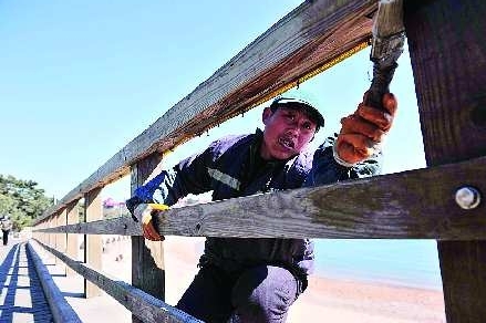 3月3日,在第二海水浴场,工作人员正在对沿海木栈道进行涂刷防腐漆。据施工人员王师傅介绍,沿海一线多处木栈道出现腐蚀、破损,不但不美观而且给游客带来安全隐患,所以近期要进行粉刷、加固整修。
