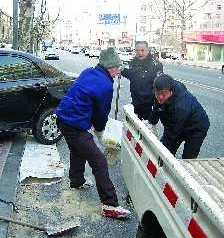 南昌路一家汽车修理行为了方便在人行道上停车、修车,用装满沙子的编织袋铺在机动车道上。3日,这家修理行被四方城管部门查处,图为执法人员清理占道沙袋。 记者 苑菲菲 通讯员 杨志衍 摄影报道