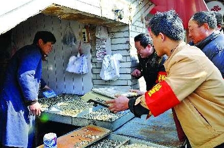 3月3日上午,威海城管执法局一大队邀请社区居民、经营业户、物业公司和志愿者当一回城管,讲解执法程序,让居民和经营业户换位体验执法工作,并提出相应建议完善执法。图为戴着“体验城管”袖标的经营业户现场管理占道经营。