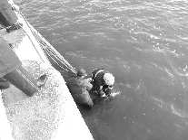 早晨6时56分,消防官兵到达现场,派出所民警及医院救护人员已经赶到。只见海堤下方两米左右,一名中年男子一手紧抓着石头缝隙,另一只手抱着一名已经昏迷的妇女,妇女全身大部分还浸在冰冷的海水中。