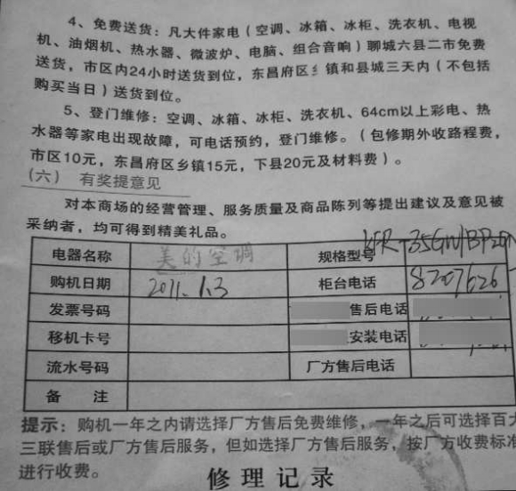 在殷女士提供的发票和空调售后维修书上,记者看到上面印有该家电商城六项承诺实施细则,其中有一条写着“市区内24小时送货到位,东昌府区乡镇和县城三天(不包括购买当日)送货到位。