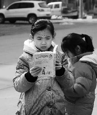 3月3日,在黄海三路一校车接送点上,两名小学生站在路边阅读课外书。车多人多,有些危险,而且阳光下读书有损视力。 本报记者 周青先 见习记者 张照朋 摄