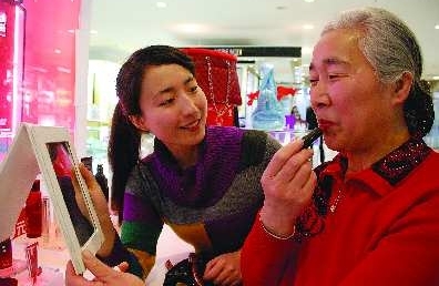 7日,在济南一商场内,为了迎接“三八”妇女节,市民李女士(左一)特地带着妈妈来挑选化妆品,希望妈妈永远年轻。实习生 刘敏 摄