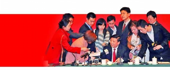 ▲7日下午,参加十一届全国人民代表大会第四次会议的山东代表团对媒体开放,媒体记者就有关山东的热点问题纷纷提问,姜大明省长一一作答。 本报特派记者 郭建政 摄