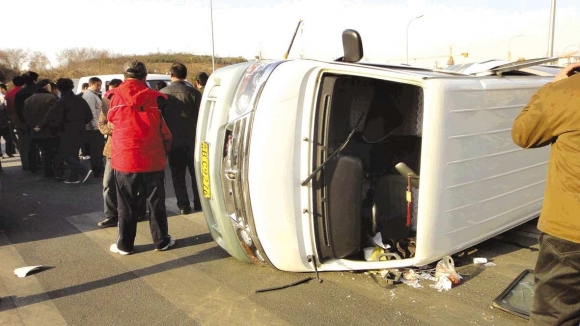 “一辆大面包车被一辆小面包车顶翻了。”16时20分,记者接到市民报料称在合肥路和劲松四路路口,一辆金杯面包车被顶翻,并有三名乘客受伤。记者赶到现场看到,一辆乳白色的金杯面包车侧翻在地上,前挡风玻璃被完全撞碎,车体右侧的中部已经被撞凹进去,一辆车体稍小的白色昌河面包车停在路边的不远处,车挡风玻璃也被撞碎。