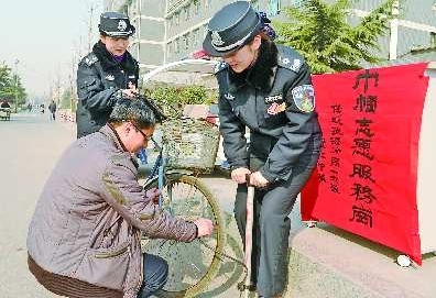 7日,济宁市城市管理综合执法局任城分局女子一中队队员以特殊方式庆祝“三八”妇女节。队员们专门设立了“巾帼自愿服务岗”提供便民服务,并走到街头、社区,清理积存垃圾、清除“乱贴乱画”。图为女子中队专门设置了巾帼自愿服务岗,为市民提供方便。 本报记者 高建璋 本报通讯员 杨阳 摄