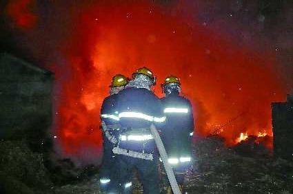 7日凌晨,微山县彭口闸乡某村一处垃圾场着火,火势很猛,并且引燃了紧邻的一处民房。微山消防接警后迅速出动,经过近3个小时的奋勇扑救,大火被成功扑灭。图为消防官兵正在灭火。