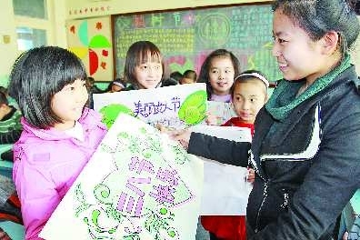3月7日,德州市实验小学向3200多名学生发出倡议:为妈妈、为女老师送上一句贴心话、一张爱心卡、一分母子(师生)情。图为四年级的学生把自制贺卡献给老师,祝老师“三八”妇女节节日快乐。