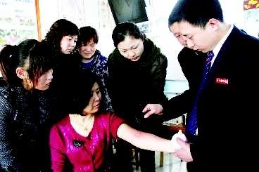7日,在新华路一家按摩学校内,按摩老师正在免费为北海路街道的多名女工作人员讲解“刮痧”的相关知识。街道王主任介绍,久坐办公室身体经常会出小毛病,特意安排单位的“姊妹”在过节的时候学门保健手艺,以后对自己和家人的健康都有帮助。