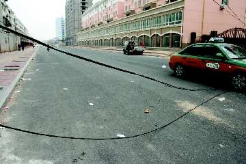 7日,在新华路北宫东街北侧,几根电缆线垂到了路面上。据附近居民介绍,这些电缆线是6日早上被车辆挂断的,垂到了路上,但是过了一天了还是没有维修好,给过往的行人造成诸多不便。
