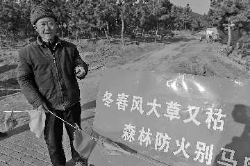 3月7日,在秦楼办事处李家台村防护林区,两位森林看护员正在林区入口执勤,禁止车辆和人员随意入林。两人说这片松林是重点防火区,所以用铁丝网围护了。