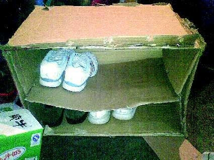 作品描述:宿舍空间有点小,难容藏鞋之地,只好自制“鞋架”节省空间。虽说质量差点,还是比较实用的啦。