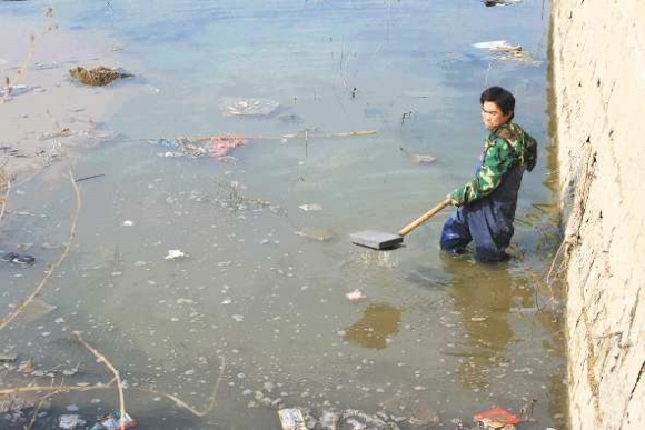 8日,东昌府区水务局工作人员站在冰冷的运河里,打捞水下的青石板,安置回原处。冬天运河结冰后,路两旁有700多块青石板,被路人扔到河中砸冰。一块青石板大约有14公斤重,打捞起来很费劲。