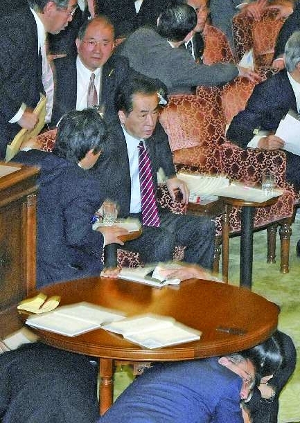 3月11日,地震发生时,日本首相菅直人正与议员在国会开会,很多议员躲到桌子底下避难。(中为菅直人)