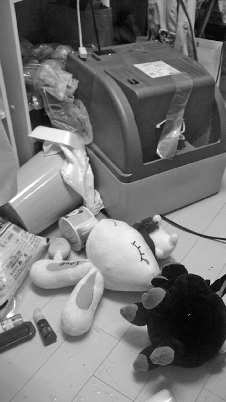 一阵猛烈的摇晃过后,我发现旁边的一块墙砖掉了。回到屋里一开门,真是大吃一惊,那真叫一片狼藉(右图)。居然连电视机都掉地上了,垃圾桶压坏了,小摆件都摔碎了。这时,我发现手机通讯也中断了。