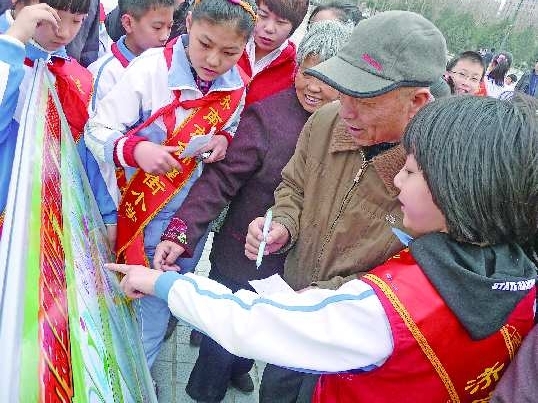 11日,济南市锦缠街小学的同学们来到泉城广场,开展了小手拉大手“爱泉护绿,人人有责”倡议签名活动。图为学生代表向市民介绍同学们设计的“爱泉护绿”标志。 本报记者 李飞 摄