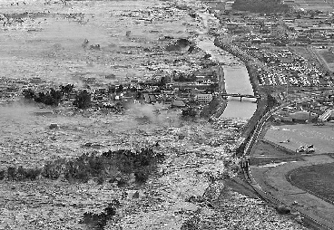 电视台录像显示,日本东北部很多地区都暴发了洪水,宫城县东北部的仙台市,遭到10米高海浪袭击。直升机拍摄的画面显示,北部多个沿海城镇发生大洪水,裹挟着集装箱、汽车以及碎片的洪水呈现黑色,而过。泥流顺着仙台市一河流逆流而上,像毯子一样将沿路农田覆盖。
