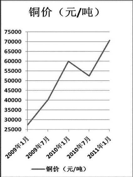 根据之前苏宁电器发布的《2011中国空调行业白皮书》显示,空调主要原材料铜、铝等价格自2009年起一直呈现上升趋势,跟2009年年初相比,2011年年初铜价上涨2.6倍,仅此一项1P挂机的成本将增加250元左右,2P柜机的成本也增加了约600元。此外,铝的价格也呈现持续上涨态势,2011年年初跟2009年年初相比也上涨了约1.4倍。此外,由于国家政策导向,空调生产企业对高能效空调压缩机需求量剧增,加上钢铁、石油、煤炭、水电等价格居高不下,导致高能效空调压缩机价格持续走高,直接导致空调生产成本增加。