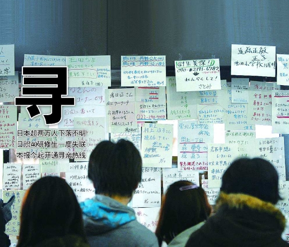 13日,在日本宫城县仙台市,人们在一个临时信息中心的布告板上寻找亲友的名字。 新华/路透