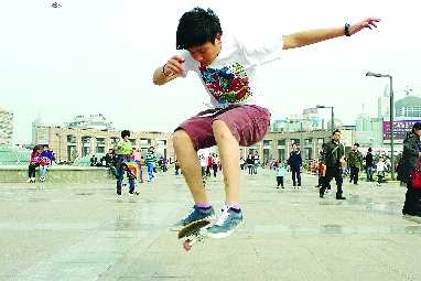 3月13日,在济南泉城广场上,几个年轻人身穿短袖T恤和短裤在玩滑板。当日济南最高气温达到22摄氏度,不少市民迫不及待地提前“入夏”,穿上了清凉的夏装。而据天气预报,14日又要大幅降温,大家在享受春暖的时候,不要忘了“春捂秋冻”之谚语。 本报记者 王媛 摄