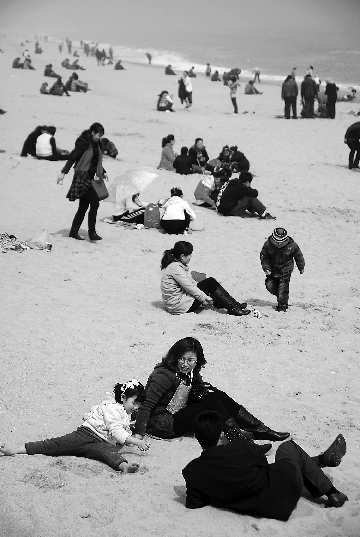 当日,还有许多市民来到万平口广场海滩游玩观海,团坐在海滩上,享受着春天里的日光浴(图③)。