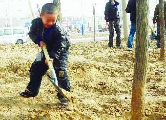 今年6岁的程梦旭小朋友为了种树还特意准备了“秘密武器”。“你看我的小铲子,从家里带的,种起树来可快了。”程梦旭说。随着树被埋在坑中,程梦旭用自己的小铲子给树进行培土,可不一会儿他发现,用铲子不如用身体来的快,干脆站在土上蹦蹦跳跳,围着树转起了圈。“这么早就种完了,要不然我能种一排……”小朋友们高兴地说。