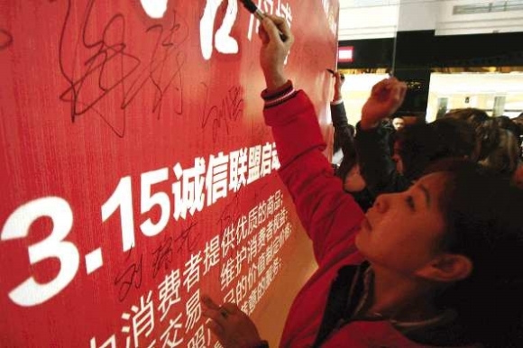 12日,在华阳路上的海博家居,商户代表正在诚信联盟板上签名。当日,青岛市市北工商分局、北仲路工商所等单位联合辖区商家成立诚信联盟,规定商户为消费者提供优质的商品,按照商品的价值制定合理价格和维护消费者利益等。本报记者 杨宁 摄影报道