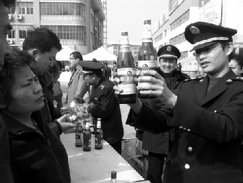 12日上午,在李村维客广场,永安路工商所执法人员现场教消费者辨认假酒。在设立识假辨假咨询台的同时,工商部门还设立了消费维权咨询台,现场受理消费者投诉。其中,手机、食品及酒类产品仍是消费者投诉咨询的重点。当天,工商人员共受理消费投诉40余件,当场办结率98%以上。