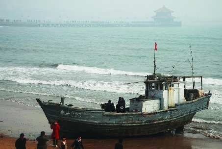 13日下午,在栈桥浴场,一艘长10余米的“青钓298”号渔船搁浅在栈桥附近的沙滩上,吸引了不少游人合影留念。该船因为螺旋桨损坏,不得不抢滩登陆进行维修,待涨潮后会重返大海。
