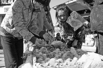 9日下午2点多,记者在昆明路一个摊位看到,很多年轻女孩儿路过时会忍不住上前看几眼,此时,摊主会说服她们购买:“买两只吧,买一只它会感到寂寞,不吃饭,买两只就能养活。”话虽如此,几乎所有人都认为“小鸡活不了几天”。摊主解释道“给它喂些小米就行”。对于小鸡身上的颜色,几位摊主的回答并不一致,部分摊主说是用涂料染上去的,还有两位摊主表示是用激光打上去的。记者用自备的水将手弄湿,摸在小鸡身上,手上有明显褪掉的色彩。