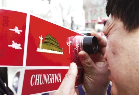 13日上午,在“3.15”国际消费者权益保护日纪念活动现场,众多假烟假酒供消费者鉴别,一市民通过40倍放大镜查看“中华”烟微缩防伪图案。