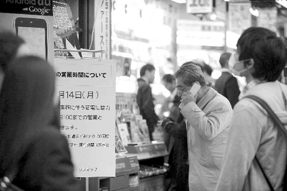3月14日,日本震后的首个工作日,东京人的工作和生活规律正在悄悄改变。其中,因地震造成的发电厂停运状况,为东京市民生活带来不便———市内多处商业场所提前打烊;作为东京人主要交通工具的地铁线,也被迫缩减运力,减少班次。