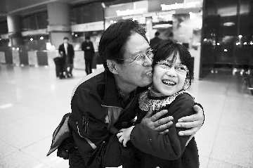 当平度市年近60岁的郑先生夫妇携手出现在接站口时,等待已久的女儿和外孙女顿时露出笑颜。