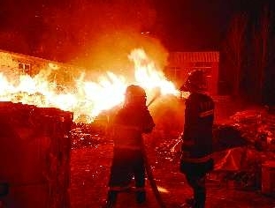 13日晚,梁山县迎宾路西侧一处废品收购站发生火灾,由于晚上风较大,火势迅速蔓延,波及附近一处仓库,仓库里存放着大量农药,属于易燃易爆物品。梁山消防经过2个多小时的奋战,将大火成功扑灭,仓库内货物安然无恙,目前,火灾原因正在调查之中。图为消防官兵正在灭火。 本报记者 陈鸿儒 本报通讯员 申天凯 摄影报道