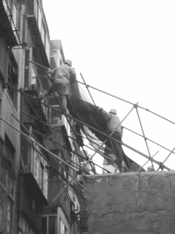 仔细一瞧,孙先生找出了原因。原来小区墙外是一处建筑工地,工地为了减少灰尘对周围的影响,利用脚手架搭建了高4层楼的架子,上面覆盖了一层防护网。在巨大的风力作用下,防护网连同脚手架一同倒向了居民楼。被刮倒的脚手架倒在了居民楼三楼部分住户的厨房窗上,将两户居民的窗户打破,所幸没有对室内居民造成伤害。其中一位住户愤怒地向工地工作人员喊叫,让他们马上修复,并且封堵道路,避免残存的玻璃掉落砸伤行人。