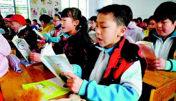 14日,临沂二小68个班级在全部实现大转移后如期上课。记者在两个新校区采访发现,第一天到新校区上课,老师挺忙碌,学生挺新鲜。图为五年级五班的学生在认真读课文。记者 罗志强 摄