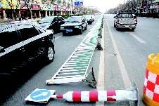 14日,在文化路和福寿街路口东侧,一串近百米的护栏被大风刮倒在地,过往车辆只能避之行驶。记者从潍坊交警支队设施大队了解到,13日夜间骤起的强风让不少路段的护栏纷纷倒地,所幸并造成人员受伤。