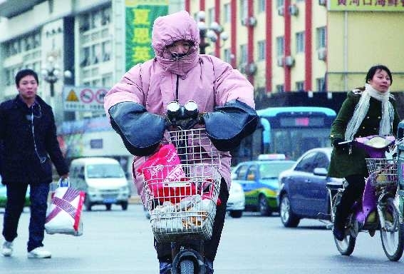 14日,记者在府前街看到,受13日晚的8级大风的影响,路灯上的中国结已经严重变形(图一)。14日东营刮起了5~6级的东北风,最高气温较13日下降17℃,中午放学的初中生不得不逆风前行(图二),而骑车出行的市民又穿上了厚厚的棉衣(图三)。 本报记者 郑美芹 本报见习记者 段学虎 任小杰 摄影报道