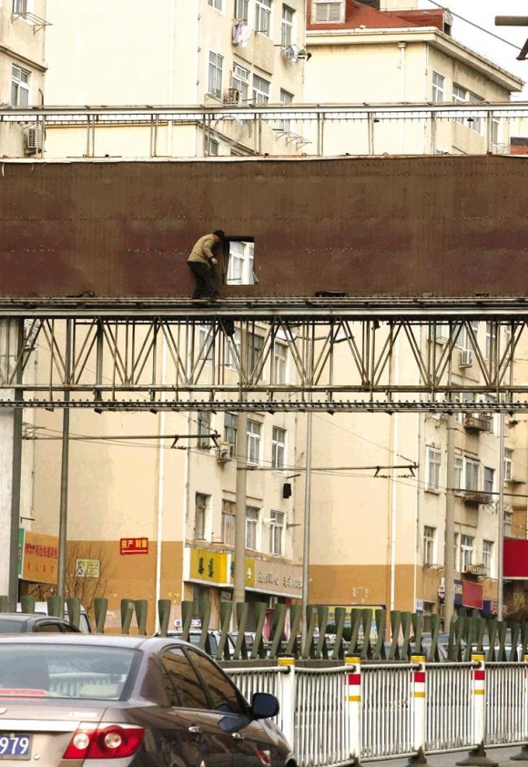 14日,在海信立交桥附近,工人正在拆除一块巨幅广告牌。据了解,这处广告牌双面面积达200余平方米,是可间歇性翻转的广告位。在一周时间内,东西快速路上所有违规设置的巨幅广告牌将陆续被拆除。 本报记者杨宁 摄影报道