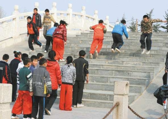 14日下午,多名小学生在老师的带领下外出活动,到东昌湖边腾龙广场附近景观桥台阶上练习蛙跳,路过的市民很担心学生们的安全。