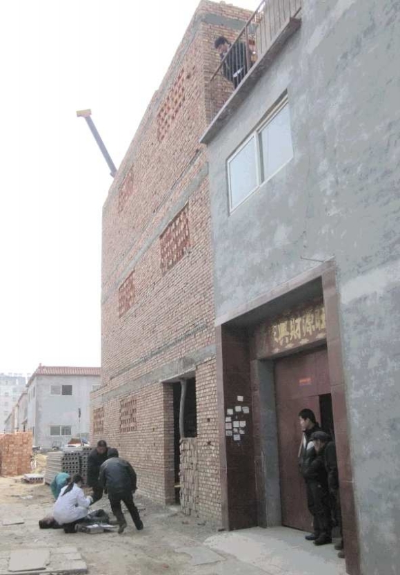 下午14时15分,记者赶到事发现场看到,在一个南北胡同里,一名男子头朝西躺在地上,一动不动,他的西侧是一座在建的3层楼房,十几名建筑工人站在附近,表情悲戚。一名蹲在地上低头抽烟的建筑工人说,这名男子是他们施工队的,下午14时左右,他站在3楼楼顶墙沿上安装矫正水泥预制板,用钢管撬一块水泥预制板时身体失去重心,摔到地面上。