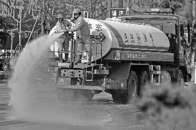 15日上午,在济宁市洸河路上,一辆洒水车正在对路面进行喷水。济宁市环卫部门为给市民创造一个清洁舒适的道路环境,每天适时安排洒水车辆在城区各主干道上作业。